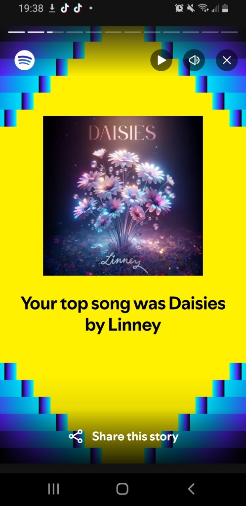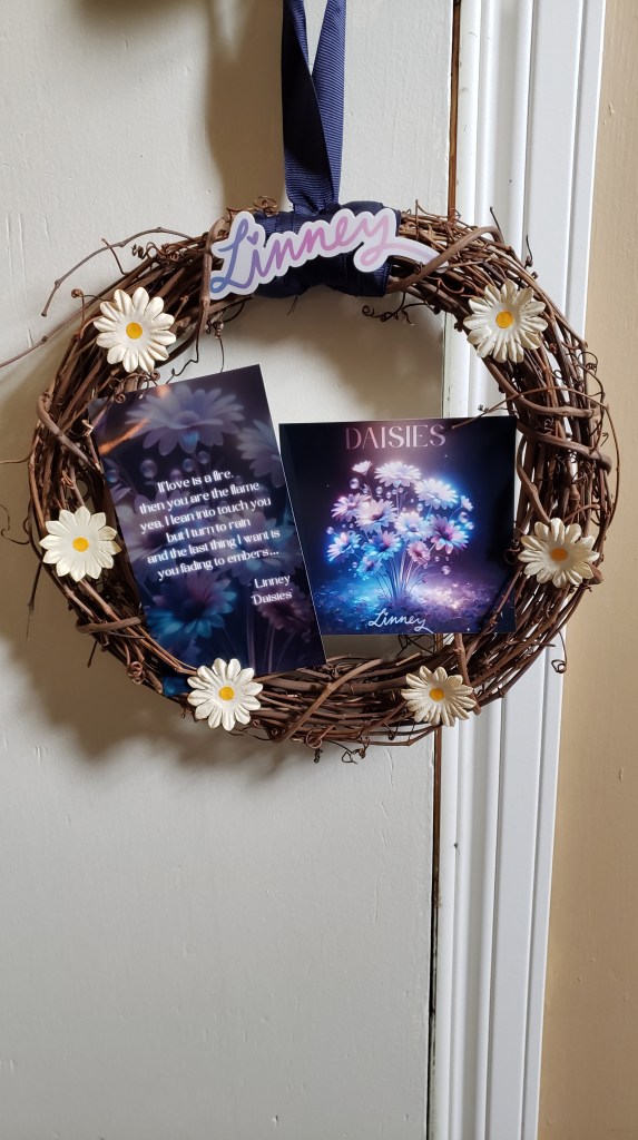 A 10″ grapevine wreath, affixed with paper daisies, and featuring the single’s cover art along with a graphic of my favourite line from the song, this one of a kind commemorative piece has been given a place of prominence in my home office, the same way the song that inspired it has been given one in my heart โฆ and I’ve got the Spotify Wrapped receipts to prove it. โฌ๏ธ