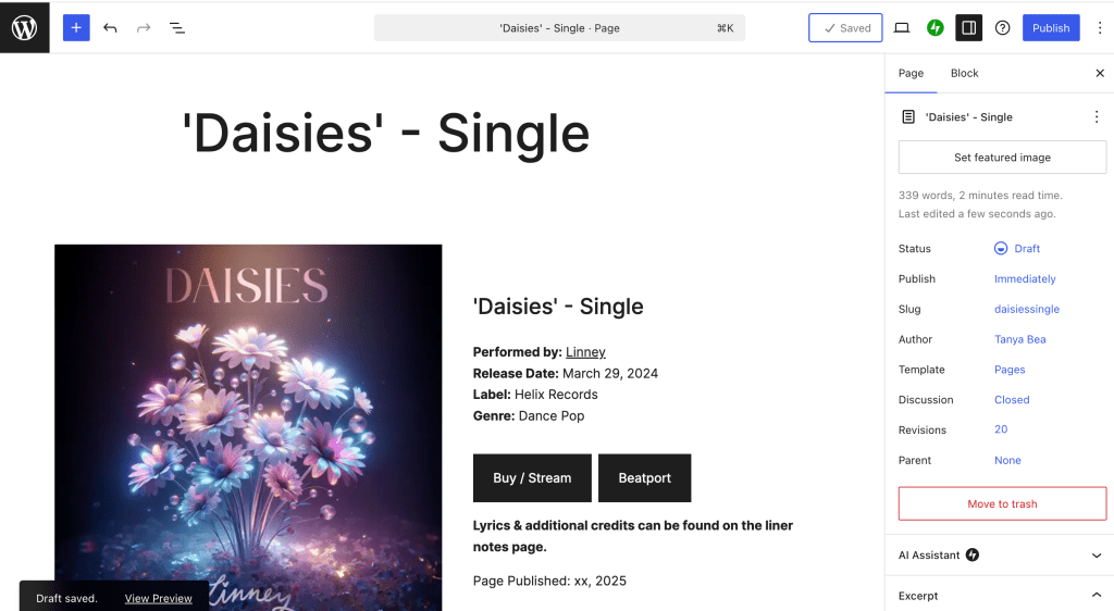 If you’d like to learn more about the track, you can also check out the record I created for the ‘Daisies’ – Single in the Linney catalogue here on the site. Like all of our catalogue records, it includes available videos, placement details, press, selected social posts* and liner notes — complete with lyrics — in case you want to sing along. ๐
